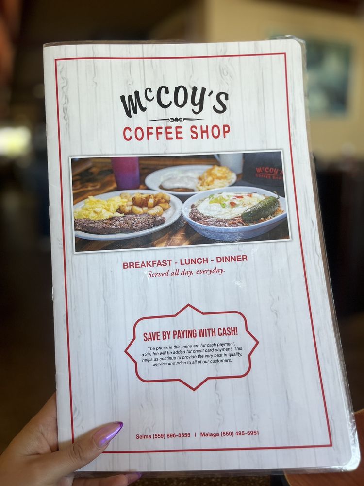 McCoy's Coffee Shop is a cozy breakfast and brunch spot located in Selma, CA. The menu offers a variety of options for all tastes, including dishes perfect for breakfast lovers. With convenient utilities like takeout, delivery, and reservations accepted, McCoy's Coffee Shop makes dining easy and enjoyable. The casual atmosphere is great for groups and families, with outdoor seating available for those who prefer to dine al fresco. The menu features a wide selection of dishes, from classic breakfast staples to more unique options. Whether you're in the mood for a hearty breakfast or a light brunch, McCoy's Coffee Shop has something for everyone. Don't forget to try their delicious coffee and relax in this inviting space.